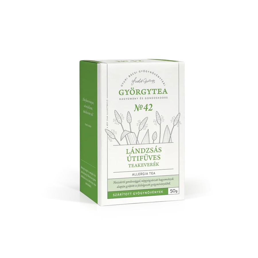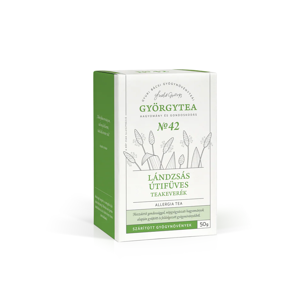 Gyuri bácsi Lándzsás útifüves teakeveréke (Allergia tea) segít a pollenallergiában szenvedőknek majdnem tünetmentesen átvészelni a nehéz időszakot. Olyan növények vannak benne, melyek szabályozzák az immunrendszer működését, segítik a szervezet védekező munkáját. A keverékben szereplő gyógynövények erősítik egymás hatását.